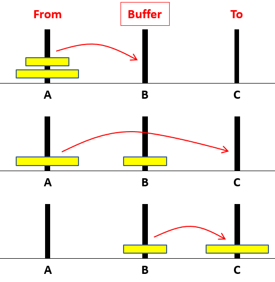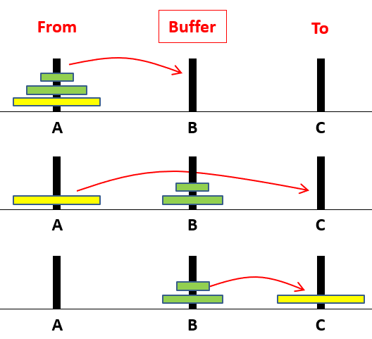 B柱當成緩衝區,須將最上面那一個圓盤先放置緩衝區,才可將最大的圓盤移至C柱 -
