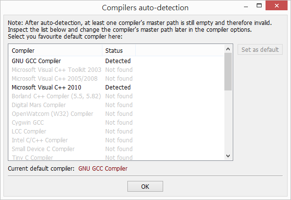 首次啟動時,會自動尋找電腦上有安裝的編譯器。大部分同學應該都只會看到 GNU GCC Compiler。選擇它,按下 [Set as default],再按下 [OK] 即可。