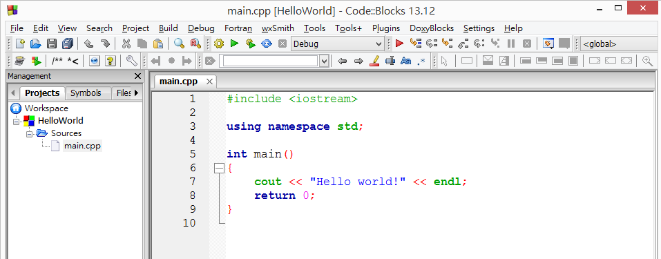 將左側專案視窗中的 HelloWorld、Sources 展開,然後在 main.cpp 上點兩下。這個程式檔會在右側開啟。