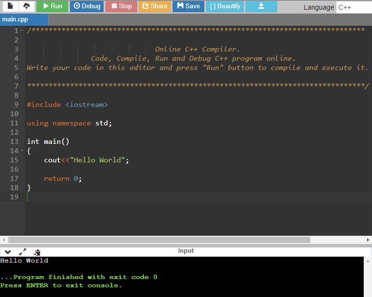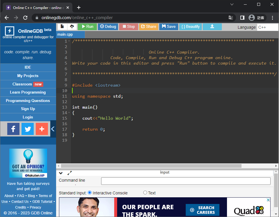如果你只是在練解題,只會寫些小程式,OnlineGDB 是一個不錯的選擇,你不用安裝開發環境,只要連上 OnlineGDB 網站,就可以直接使用。