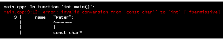 name = "Peter"; // <--我們在這裡把字串放入整數型別的變數裡