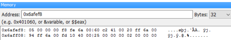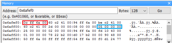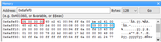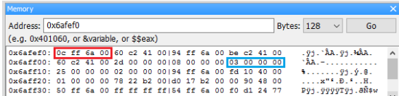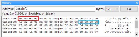 接著到 Memory dump 中找到 0x6aff0c 的地方,確認 03 00 00 00 在那裡。