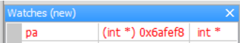 用 watch 觀察 pa 的值,我們可以看到儲存 a 的記憶體位址,你看到的值可能有所不同,這是因為每次程式載入時會在記憶體的哪個地方是不一定的。